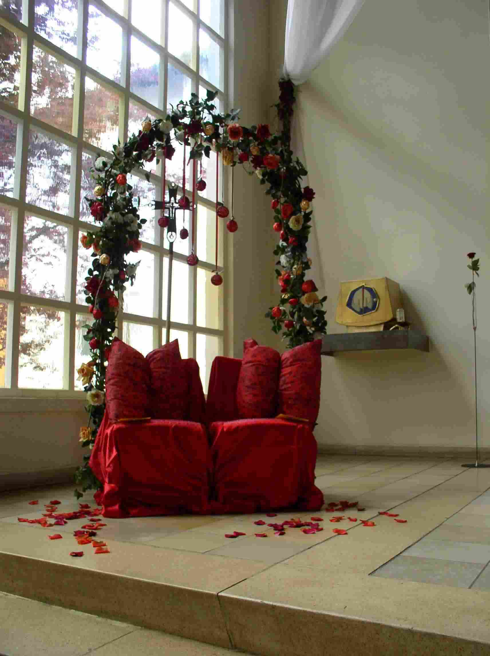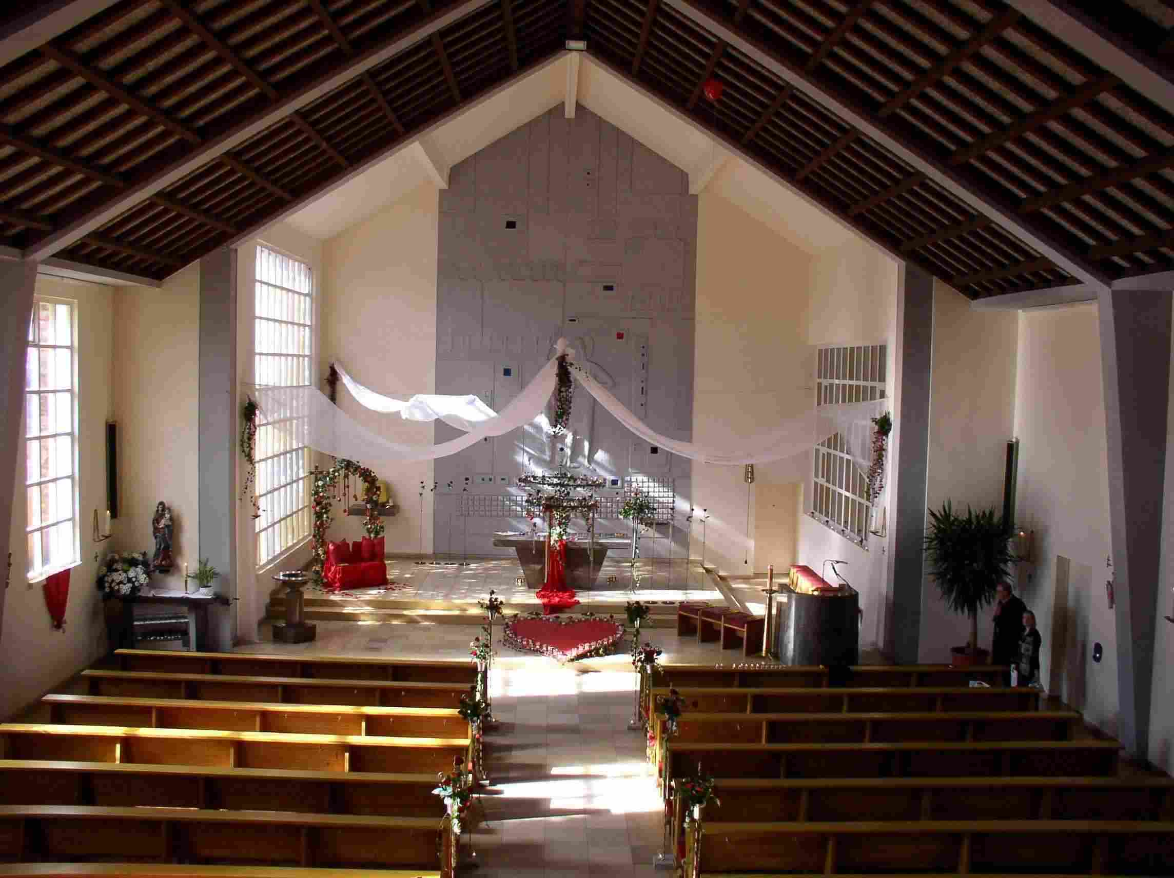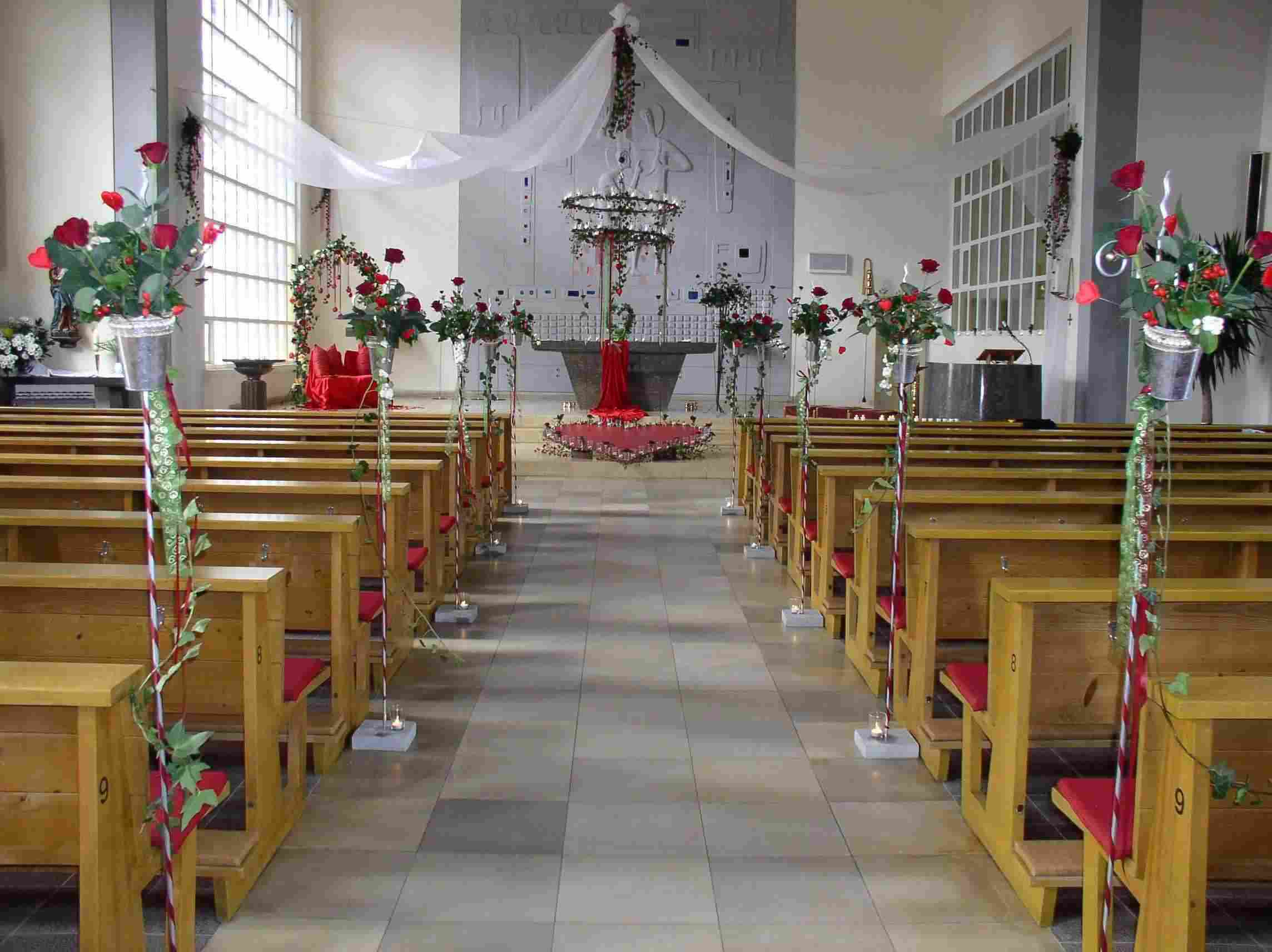 Rosengestecke und vor dem Altar ein großes rotes Herz mit vielen kleinen Kerzen.